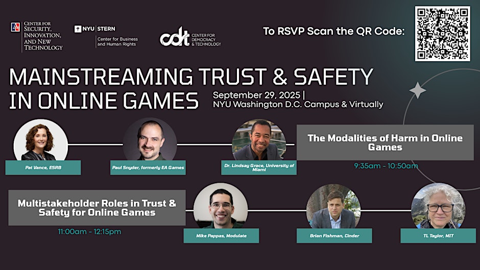 - 2025: Mainstreaming Trust and Safety in Online Games (with Pat Vance and Paul Snyder), New York University, Washington DC, USA