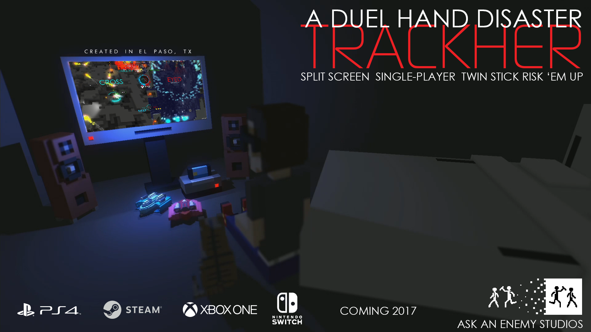 A Duel Hand Disaster: Trackher is a Split-Screen Single Player Twin Stick Risk 'Em Up where your score is meaningless unless you exist. Playing till death is not an option. You must decide when to leave with your score. Every new run will wipe your previous leaderboard position which you must then replace with your new score. If you die not only did you lose your rank you also lost all progress towards a new one. Don't lose sight of your mission. Trackher.