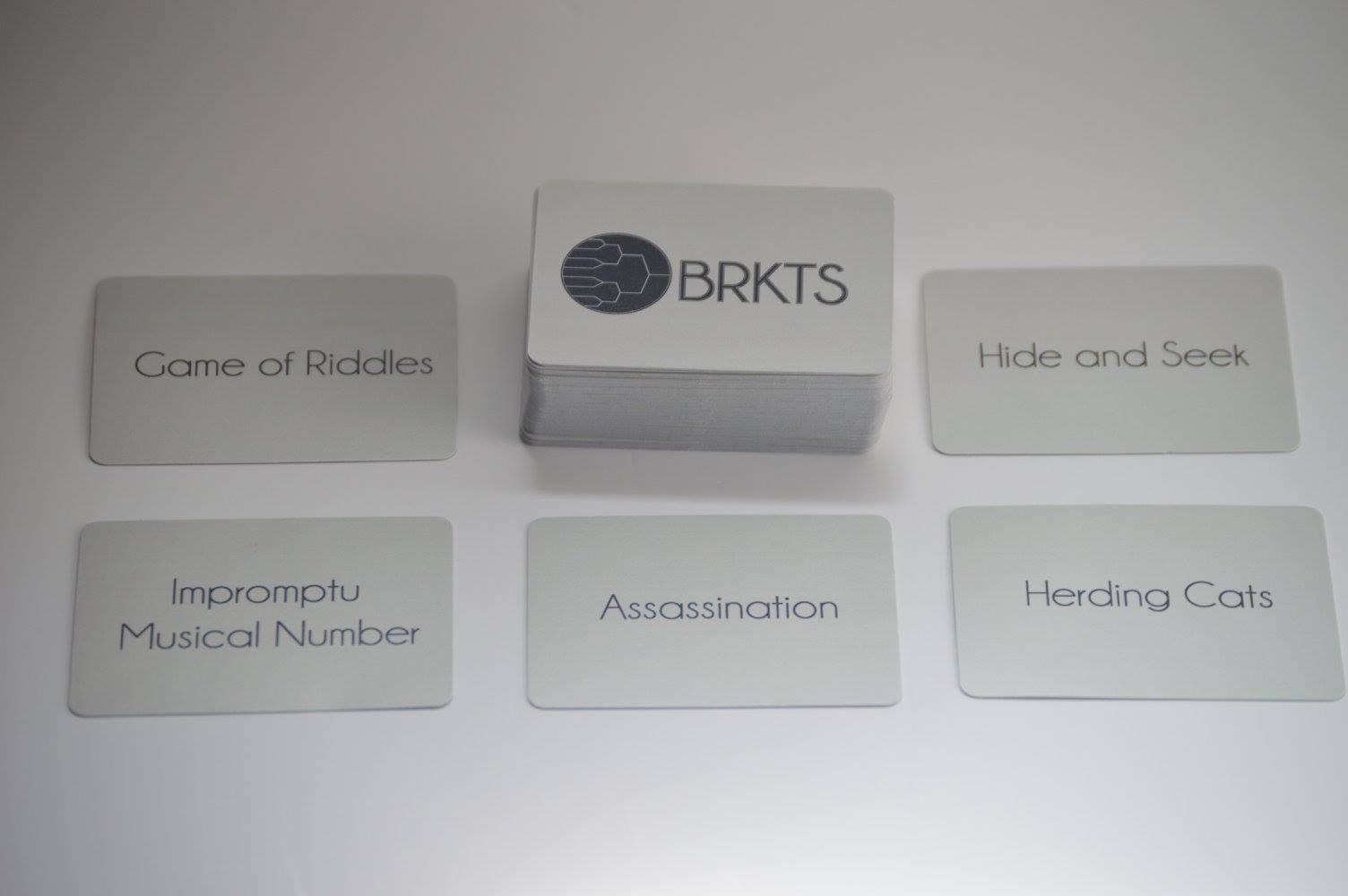 BRKTS: Lets say you have 4 players and an extra person to be the moderator. Now you have two decks of cards. The first deck is a set of twenty-five dark grey category cards. The categories are things such as, comic book heroes, aliens, children's book characters, famous duos, and reality tv stars. The moderator will pull a category card and we'll say it's, sidekicks. So the four people playing will each pick two sidekicks since it's an eight spot bracket. They can be pulled from TV shows, movies, books, comics, cartoons, video games, from where ever they can think of. The moderator fills out the bracket with everyone's choices then moves on to the set of seventy-five light grey scenario cards. These will tell you what the challenges are for the characters on the bracket. Each new match up gets a new scenario. So we'll say the first match up is Robin versus Ron Weasley and the scenario is a game of chess. Now the two players that picked those characters have to debate why their character would beat the other player's character in a game of chess. The players take turns laying out their case by being as creative as possible, highlighting their characters strong points, or their opponents lack thereof, when it comes to that scenario, or using their phone to look up info that proves their character has done this scenario before or something like it. And if the other players playing have info to share on the subject they can jump in add their two cent. The moderator also plays a part here by making sure the debate doesn't carry on for too long. To move your character on in the bracket your opponent either has to give up, or you have to win a table vote if neither party is willing to admit defeat. The other players will vote based on the arguments heard. This process continues until one person's character makes it to the end of the bracket.