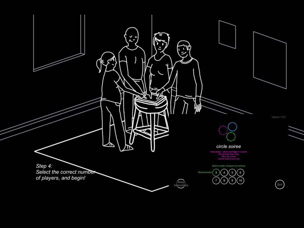 Circle Soiree is a tablet-based party game for 3-10 people.To play, each player must place one finger in a circle and never leave or let go of the circle. Once the circles start to move and animate, the players must work as a team. They all have to keep their fingers in the circles as long as possible, this means they have to climb over and under each other, as well as keep moving all the way around the tablet.