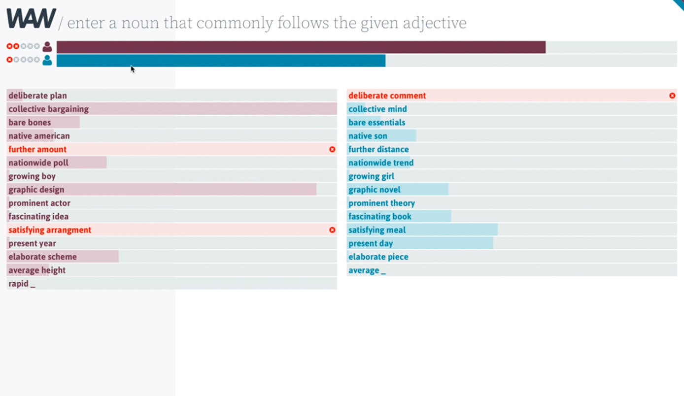 Word after Word:The game is played by two to four people, each with their own keyboard. Each player is given the same randomly generated series of adjectives one at a time. For each adjective, each player tries to identify the noun that most commonly follows it (e.g. fast CAR). Each player is given a score based on how often their noun follows the given adjective in a dataset compiled from over a half a billion words taken from magazines, tv, and books. For each prompt, there are potentially thousands of correct answers of varying degrees. As an example, let’s say players were given the word “traditional.” In the dataset, there are approximately 2000 nouns that would be accepted and scored. High scoring answers would be: role, family, and music. The first to a given score wins.
